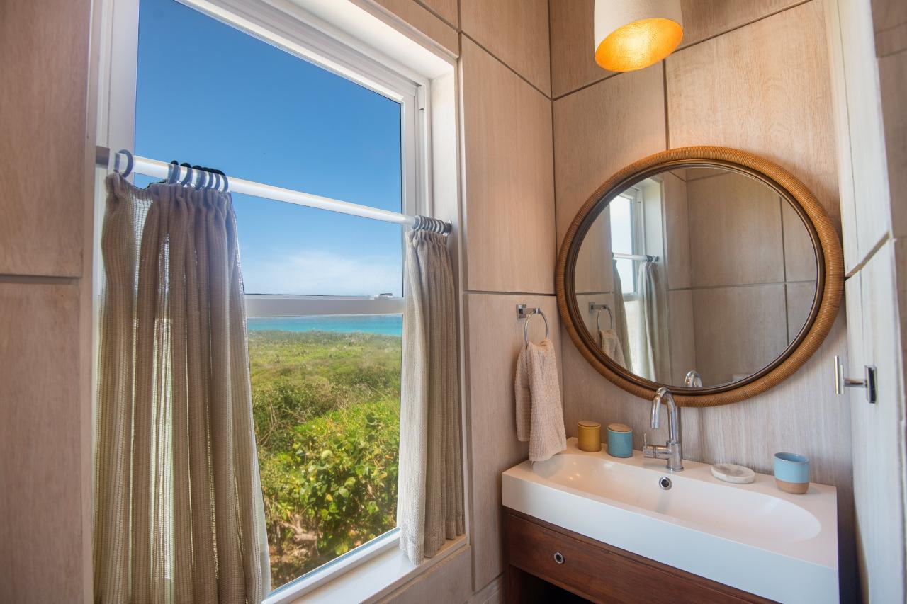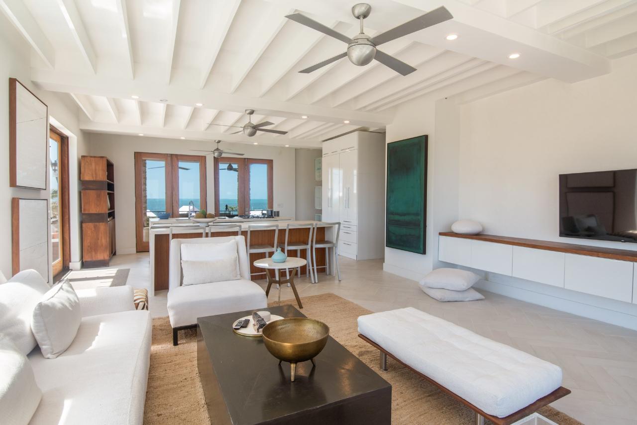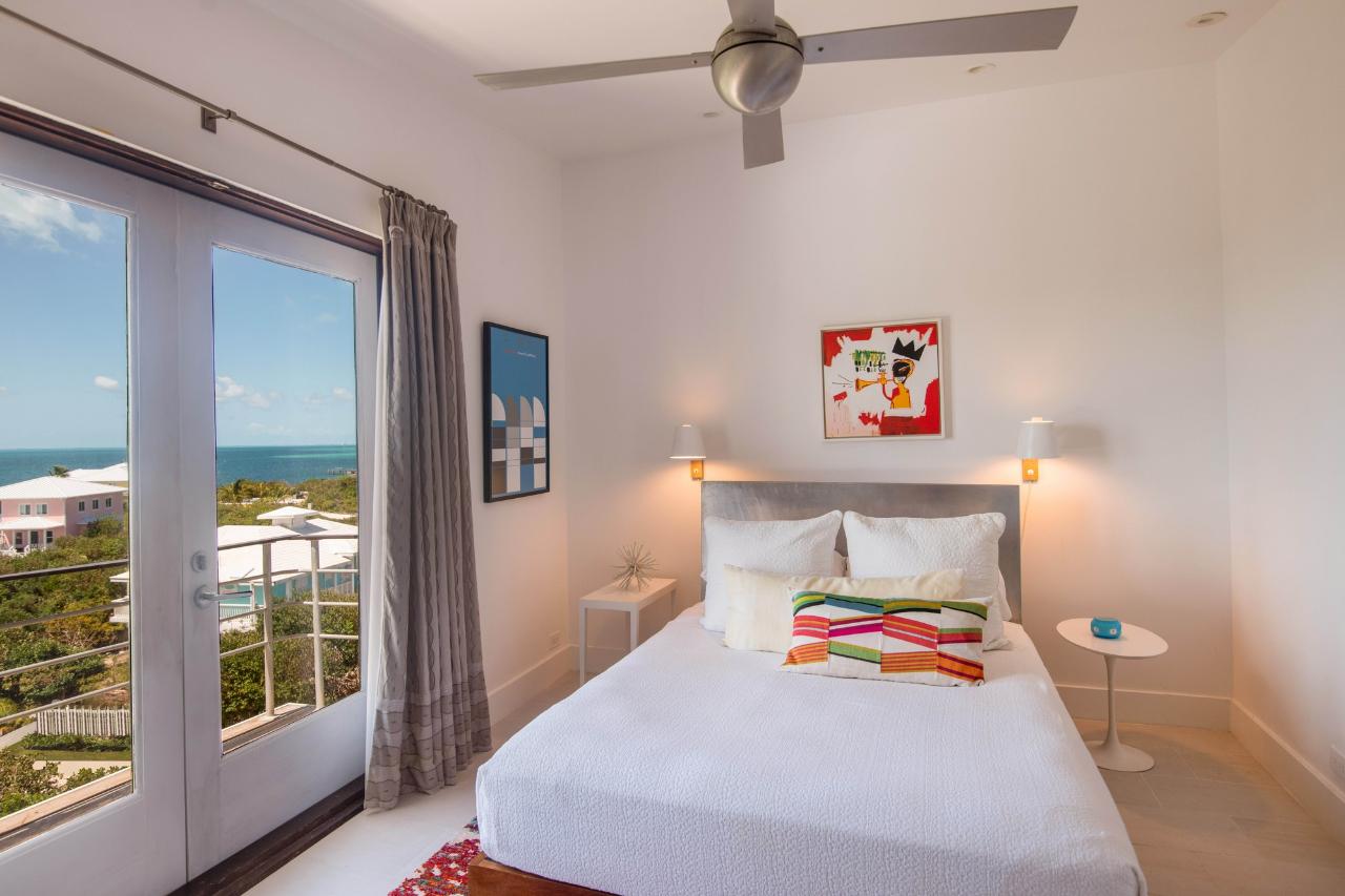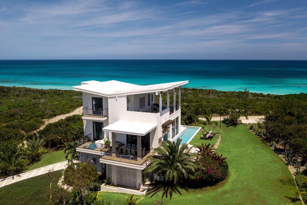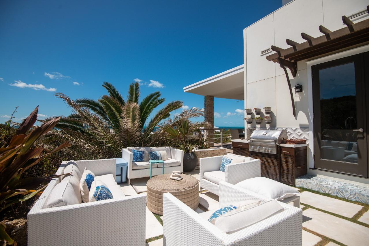 Taking island living to the next level, New Heights is a modern, 8 bed, 10 bath, three-level residence, with almost 4,700 sq. ft. of interior space, and an additional 800 sq. ft. of outdoor living space under roof. Sitting high on the pristine island of Great Guana Cay in the Abacos, this spectacular home offers unobstructed panoramic views of the Atlantic Ocean and Sea of Abaco, and is only a stone’s throw away from the powdery white sand beach with the third largest coral reef in the Northern Hemisphere. This turnkey property seamlessly blends eight outside verandas, patios, and balconies with stunning contemporary interiors and lush gardens.. The open plan living area on the main floor is filled with natural light and boasts vaulted ceilings, a gourmet kitchen with high-end appliances, a bar area, and a spacious dining area.The living area has custom-designed furniture with high-end outdoor fabrics.. The main level has large mahogany and glass doors that lead out to a wrap-around terrace with outdoor covered dining and patio by the pool .