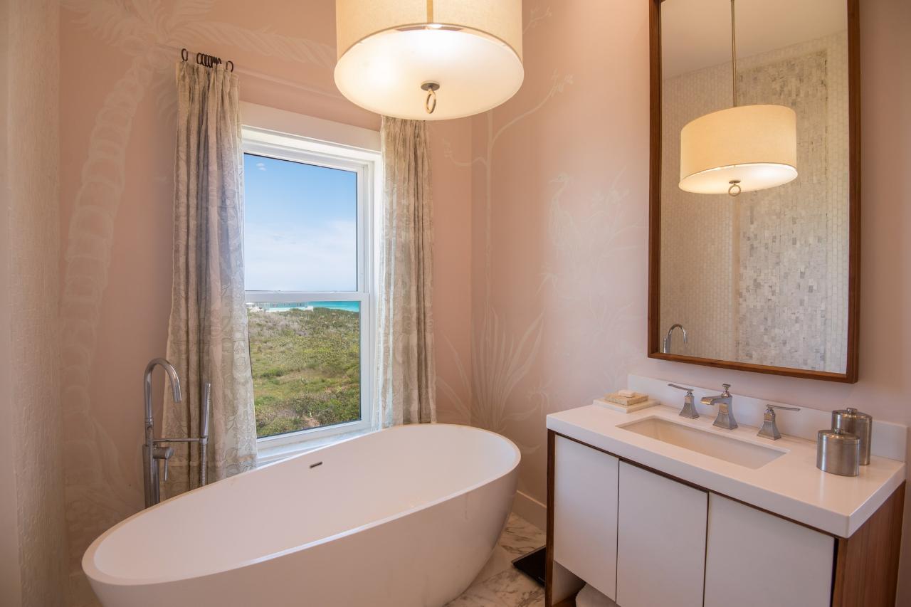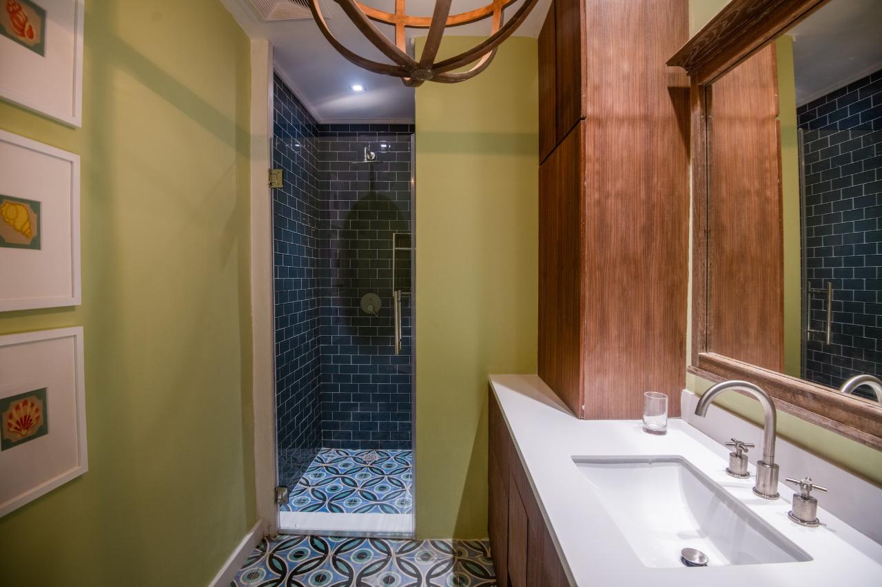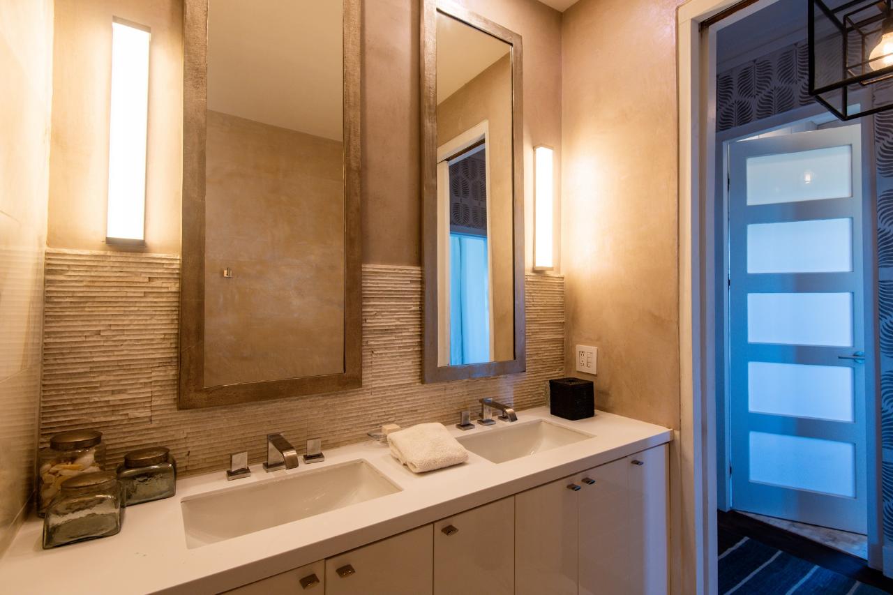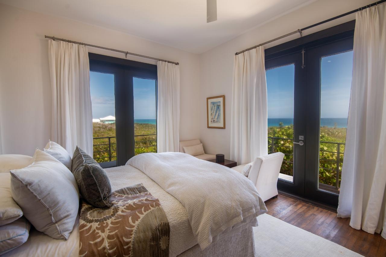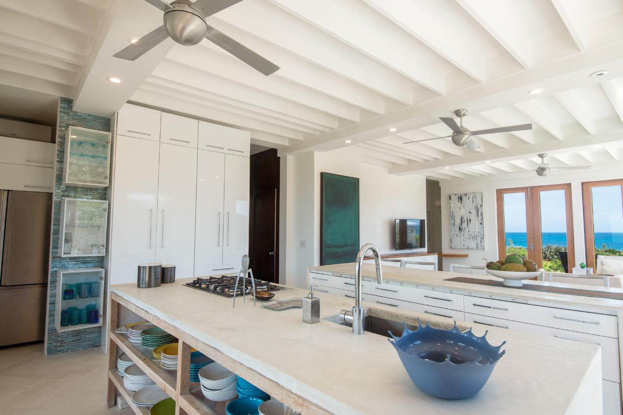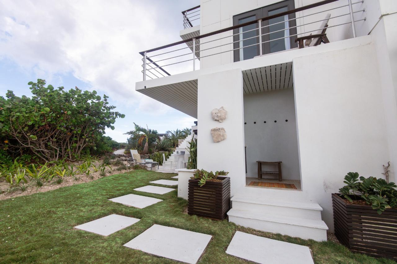 Taking island living to the next level, New Heights is a modern, 8 bed, 10 bath, three-level residence, with almost 4,700 sq. ft. of interior space, and an additional 800 sq. ft. of outdoor living space under roof. Sitting high on the pristine island of Great Guana Cay in the Abacos, this spectacular home offers unobstructed panoramic views of the Atlantic Ocean and Sea of Abaco, and is only a stone’s throw away from the powdery white sand beach with the third largest coral reef in the Northern Hemisphere. This turnkey property seamlessly blends eight outside verandas, patios, and balconies with stunning contemporary interiors and lush gardens.. The open plan living area on the main floor is filled with natural light and boasts vaulted ceilings, a gourmet kitchen with high-end appliances, a bar area, and a spacious dining area.The living area has custom-designed furniture with high-end outdoor fabrics.. The main level has large mahogany and glass doors that lead out to a wrap-around terrace with outdoor covered dining and patio by the pool .