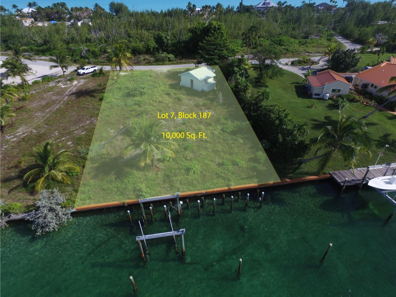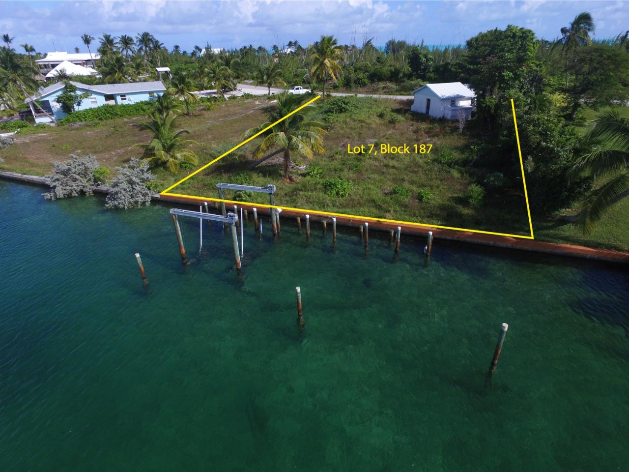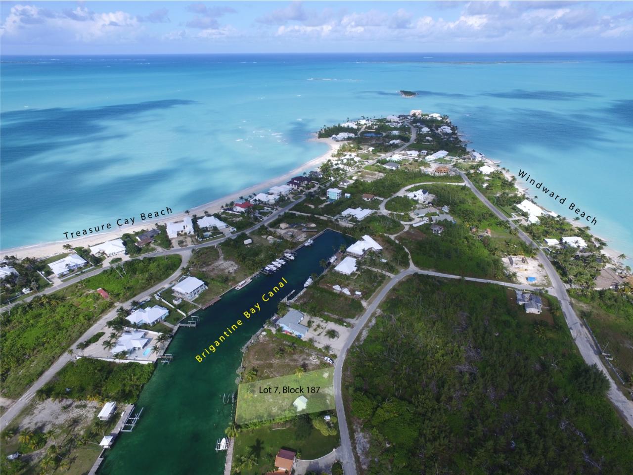 Canal Parcel 7, Block 187 is a single-family residential parcel situated on tranquil and beautiful Brigantine Bay canal. Build your new home looking down the canal. This prime property of 10,000 square feet offers exceptional water views along the length of Brigantine Bay. The 80'of bulk-headed canal frontage provides the potential for protected and private deep-water dockage just a few steps from your prospective home. The dock pilings for a lay-along dock are in place as is a boat lift frame. The exceptional property depth of 125’ allows the construction of the house of your dreams within this building envelope. This property also includes an existing large golf cart garage. Average low tide water depth is 5 feet. All property utilities, including municipal water, electricity, Internet access, telephone and trash pickup are available at the property street boundary line. Enjoy quick and easy access along Brigantine Bay to the Sea of Abaco and surrounding cays. Minutes golf cart ride from 3.5-mile Treasure Cay Beach & shopping.